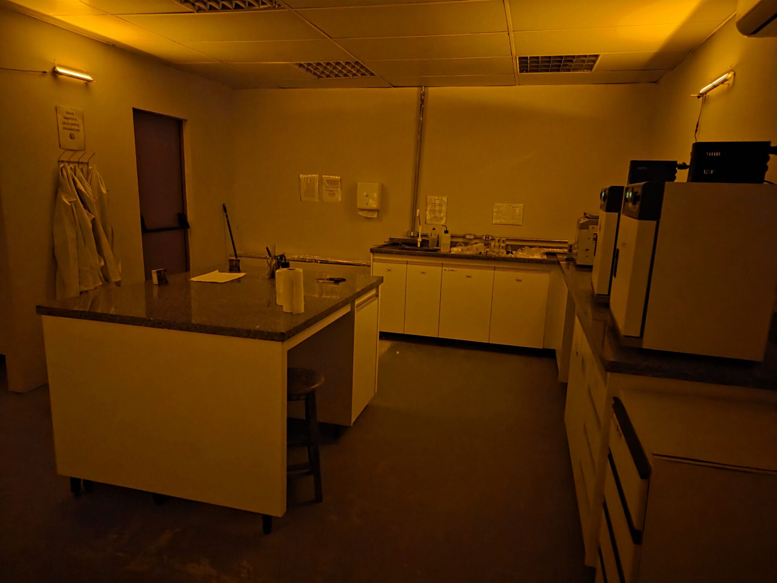 Sample preparation room – equipped with subdued ambar lighting to ensure controlled conditions for luminescence work, this room contains wet and dry sieving systems, a decantation system, a fume hood for chemical treatments (H₂O₂, HCl, and HF), a heavy liquid (LMT) separation system, dryers, centrifuge, and ultrasonic baths.
