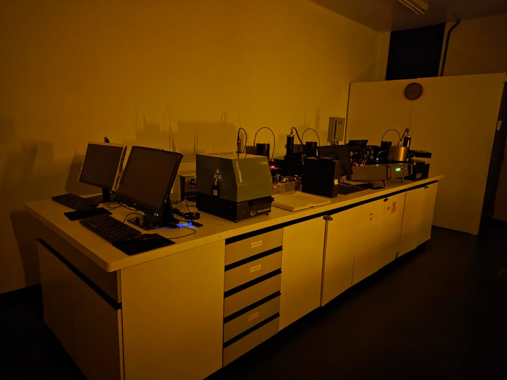 Luminescence readers room – also maintained under subdued ambar lighting, this room houses four readers, including Risø TL/OSL systems and a Lexsyg Smart TL/OSL reader, all equipped with blue and infrared stimulation units and β-source irradiation units (⁹⁰Sr/⁹⁰Y), with carousels accommodating up to 48 and 40 aliquots simultaneously. The Risø TL/OSL systems also include one single-grain attachment with green laser stimulation, an X–Y positioning system, and capacity for 100 grains per disc (up to 4,800 grains per sequence), as well as a Roithner violet laser attachment (405 nm) and a Risø DASH system.